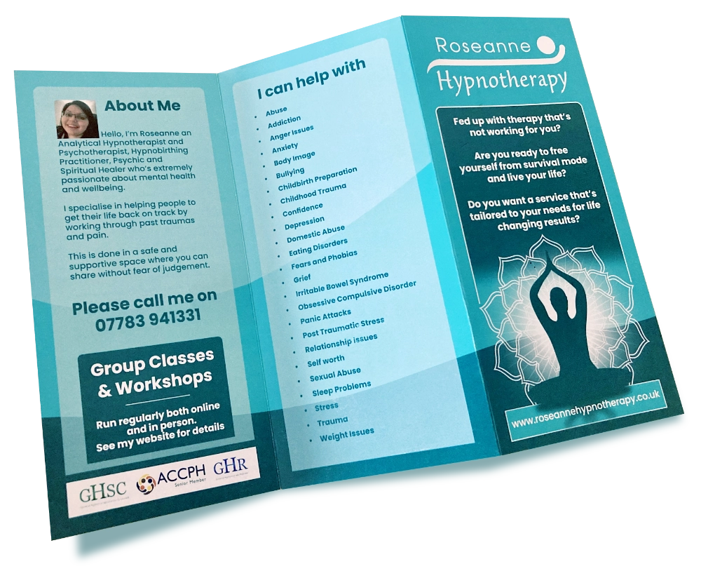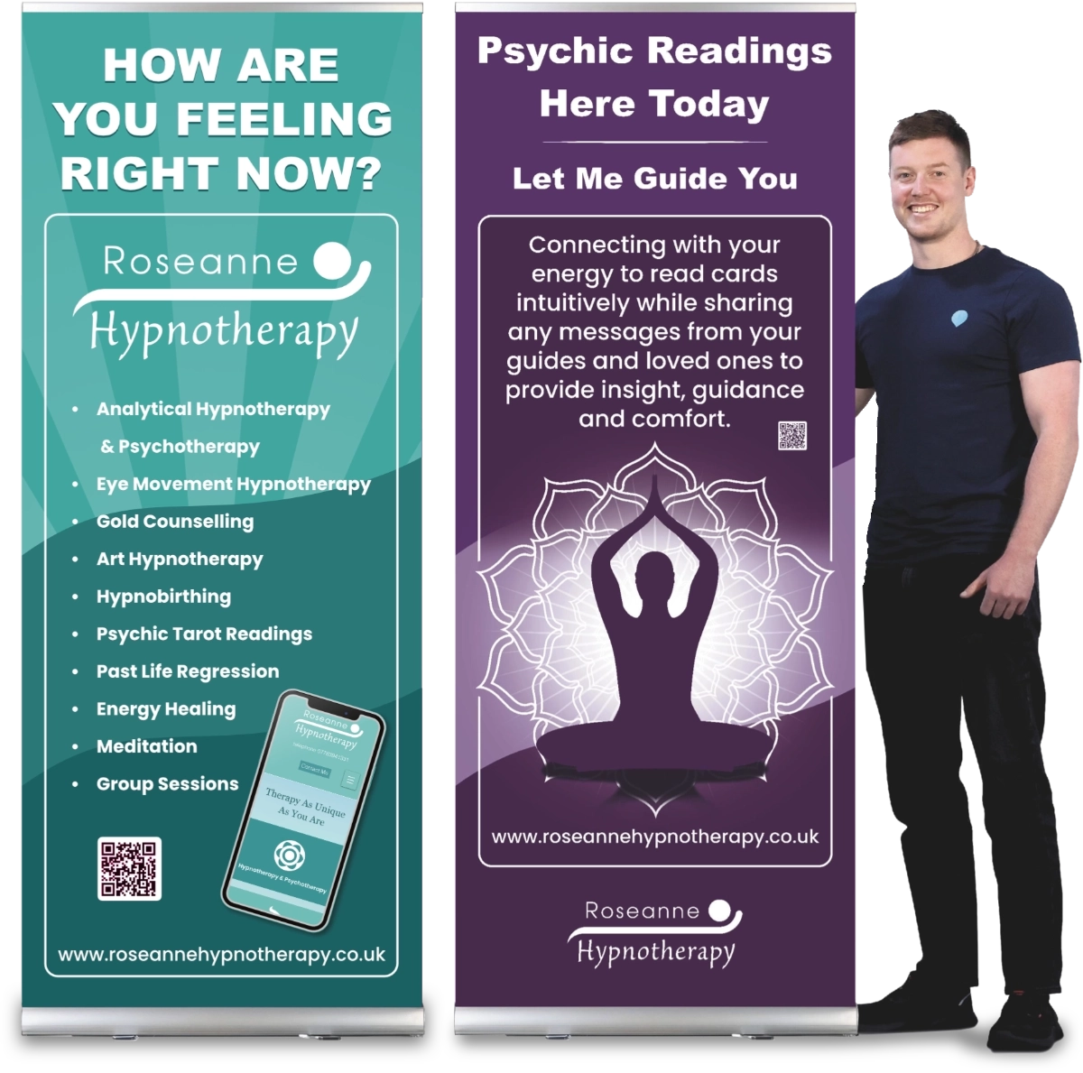 Since designing Roseanne’s logo, we have created designs for many of the classic printed materials most businesses need. From the humble, though often underrated, business card to roller banners and more.
